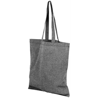 150 g/m² katoenen handtas met een hengsel van 31 cm. Gerecycled katoen wordt vervaardigd uit voor consumenten bestemd afval dat in textielfabrieken tijdens het snijproces wordt geproduceerd. Soortgelijke kleuren worden met elkaar gemengd, waardoor verven