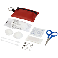Polyester etui met sleutelring met 16 EHBO-benodigdheden. Zeer geschikt voor reizen, festivals, evenementen en andere buitenactiviteiten, en met een groot decoratievlak. Een EHBO-set wordt beschouwd als een medisch hulpmiddel en is onderworpen aan 93/42/E