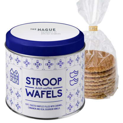 Blikje, geschikt voor o.a. een pakje stroopwafels. Het blikje is te bedrukken op de deksel. Gevuld met een pakje verse stroopwafels.