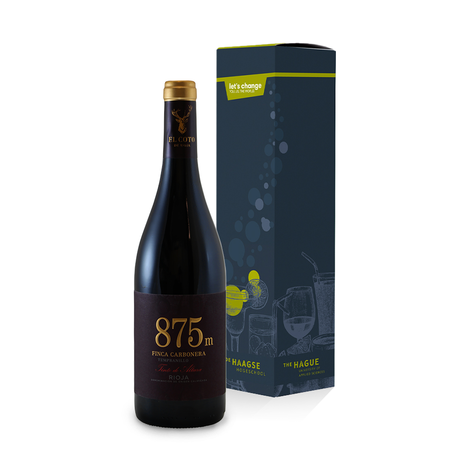 Luxueuze wijndoos met een heerlijke wijn uit Spanje: El Coto de Rioja 875m Tempranillo (0.75L). De doos is speciaal gemaakt in de stijl van uw bedrijf.