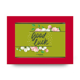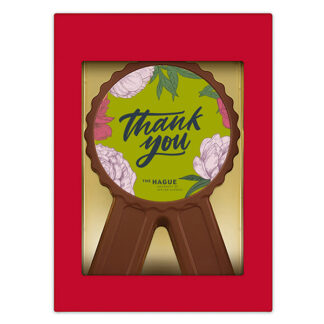 Een rode vensterdoos voorzien van een melkchocolade wenskaart (150 gram) en een marsepeinen laagje (25gram) met de tekst HAPPY BIRTHDAY en jouw bedrijfslogo. Het marsepeinen laagje wordt met cacaoboter bevestigd, waardoor het geschenk één geheel wordt. De chocolade is gemaakt van onze eigen duurzame (Cocoa Horizons) chocoladerecepten van het Belgische topmerk Barry Callebaut.