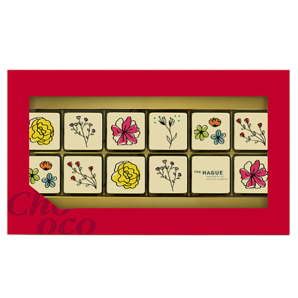 Red giftbox with 12 logo chocolates | Cocoa Horizons-Certified milk and with chocolate couverture from the Belgian top brand Barry Callebaut | In full color we can print any design, image or logo | More than 1 logo per giftbox: + 10% fee |Order quantity > 9.600 pieces, price on request | Available in multiples of 40 pieces | Fast delivery | Personalized box possible from 500 pieces | Setup costs for free!