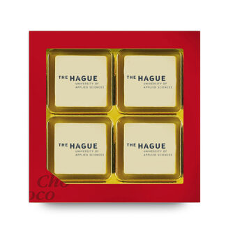 Een rood geschenkdoosje voorzien van 4 logobonbons. De pralines bestaan uit witte chocolade met een hazelnoot-praliné vulling en zijn gemaakt van duurzaam geproduceerde (Cocoa Horizons) chocoladerecepten van het Belgische merk Barry Callebaut. Een perfect kleinigheidje om te overhandigen.