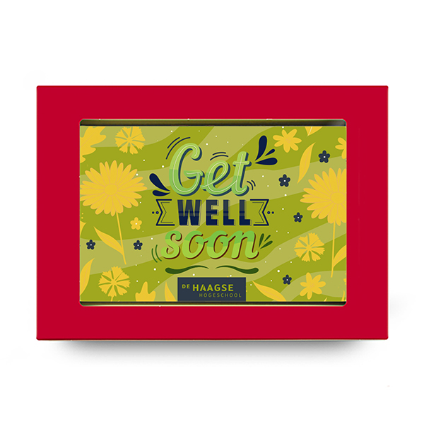 Een rode vensterdoos voorzien van een melkchocolade wenskaart (150 gram) en een marsepeinen laagje (25gram) met de tekst GET WELL SOON en het HHS bedrijfslogo. Het marsepeinen laagje wordt met cacaoboter bevestigd, waardoor het geschenk één geheel wordt. De chocolade is gemaakt van onze eigen duurzame (Cocoa Horizons) chocoladerecepten van het Belgische topmerk Barry Callebaut.