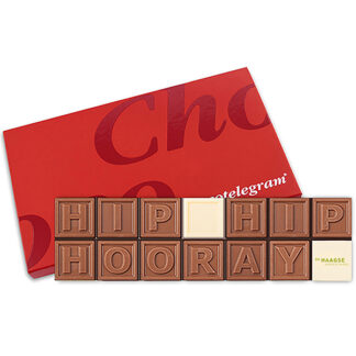De lekkerste maar ook de éérste chocoladeboodschap wereldwijd. De tekst Good Luck in duurzaam geproduceerde (Cocoa Horizons) chocolade van het Belgische topmerk Barry Callebaut. Het Chocotelegram® wordt verpakt in een luxe rode geschenkdoos, de inlegger is goud van kleur.