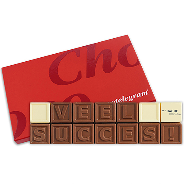 The chocolate squares are made of the finest Belgian chocolate (Cocoa Horizons-Certified from the top brand Barry Callebaut), milk, white and/or dark couverture | With 2 rows of 7 characters you can create your own sweet message | The Chocotelegrams are packed in a luxurious red gift box |Order quantity > 5.000 pieces, price on request | Available in multiples of 40 pieces | Fast delivery | Available in bulk delivery at 1 address or sent individually to multiple addresses