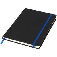En stijlvol zwart notitieboek met een zachteomslag. Voorzien van gekleurde randen bladwijzer, penlus en sluitband in een bijpassende kleur. Inclusief effen zwarte stylus balpen. Bevat 96 bladen (70g/m2) crèmekleurig gelinieerd papier. PU Plastic.