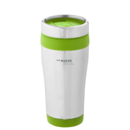 Dubbelwandige geïsoleerde beker met schroefdop en schuiflipje. Inhoud 410 ml. Roestvrijstaal, Plastic.