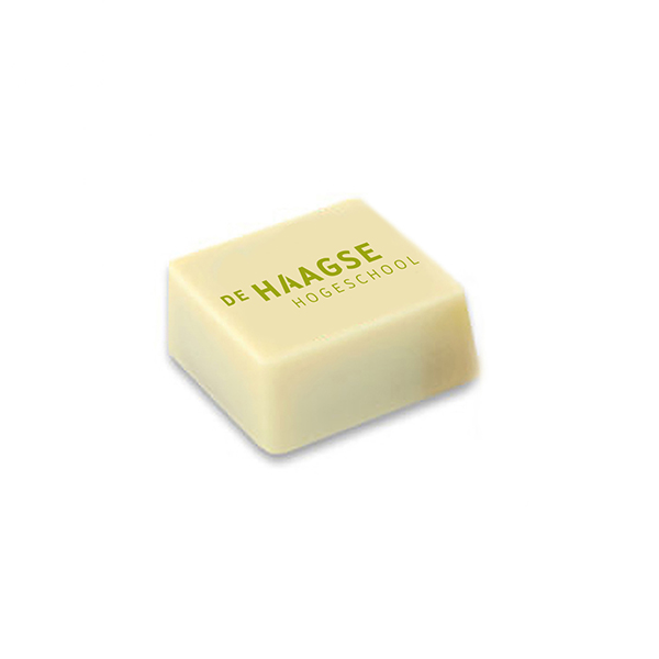 Handmade pralines of Cocoa Horizons-Certified finest white chocolate from the Belgian top brand Barry Callebaut, richly provided with a high-quality hazelnut praline filling | In full color we can print any design, image or logo | The chocolates are packed per 48 pieces in a golden tray, not wrapped individually |Order quantity > 10.000 pieces, price on request | Available in multiples of 48 pieces | Fast delivery | Setup costs for free!