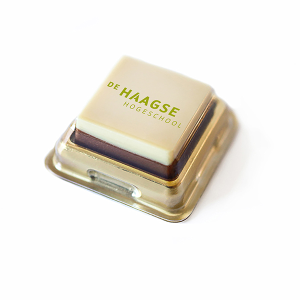 The chocolate squares are made of the finest chocolate (Cocoa Horizons-Certified from the Belgian top brand Barry Callebaut), white and milk couverture | In full color we can print every design, image or logo | The chocolates are individually wrapped in a golden blister with transparent lid |Order quantity > 10.000 pieces, price on request | Available in multiples of 50 pieces | Fast delivery | Setup costs for free!